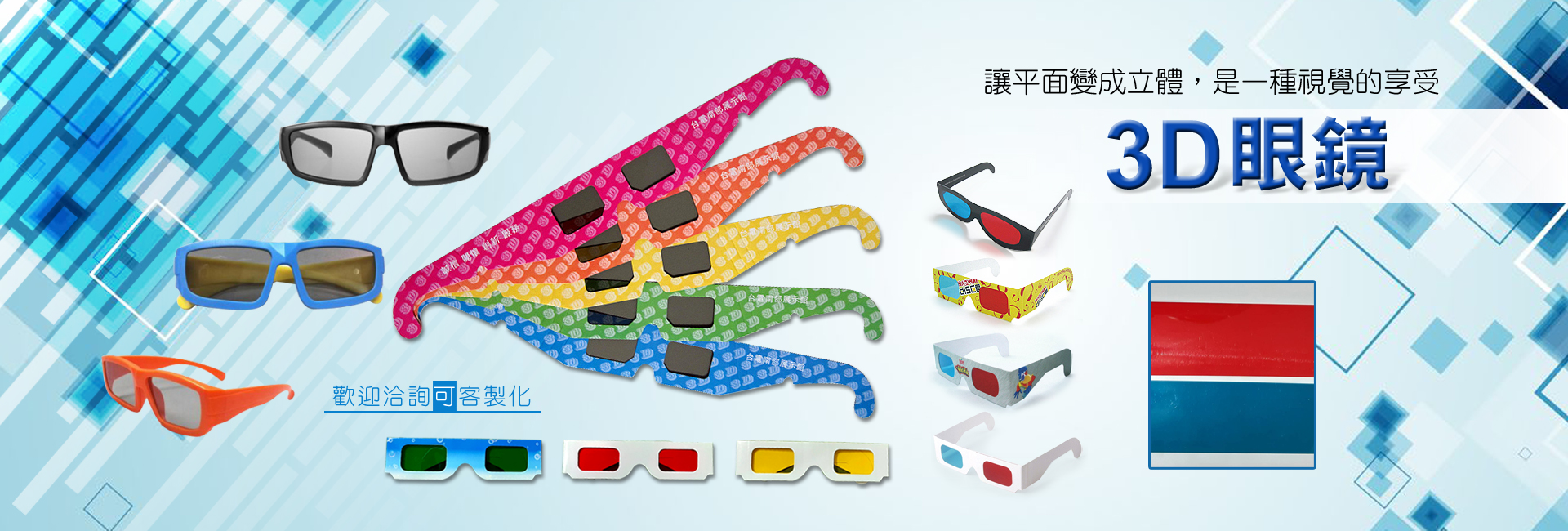 3D眼鏡款式: 3D紅藍紙眼鏡、圓偏光及線偏光紙眼鏡、圓偏光及線偏光摺疊眼鏡、煙火紙眼鏡、雙光分離紙眼鏡。