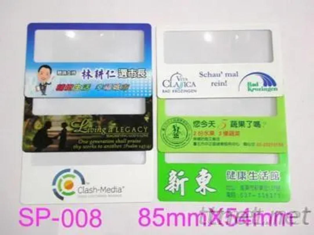 a. 超薄放大鏡款式: 名片全型、名片半型、書籤型、卡片型、閱讀型、軟磁書籤型、全彩紙卡放大鏡。