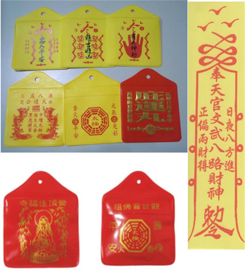 c. 宗教用品: 佛牌、平安符、護身符、復古式布香火袋、琉璃、車掛飾品、金箔、 壓紋金箔、彩色金箔、能量金箔、能量貼紙。