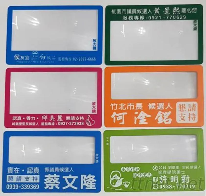 a. 超薄放大鏡款式: 名片全型、名片半型、書籤型、卡片型、閱讀型、軟磁書籤型、全彩紙卡放大鏡。